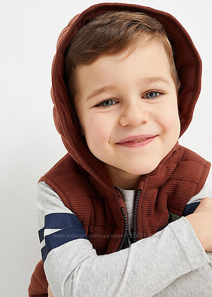 Стеганый жилет с подкладкой из рубчатой ткани с капюшоном, аппликацией и принтом.