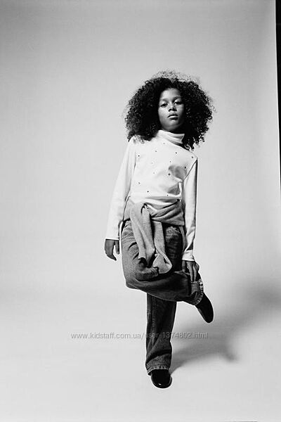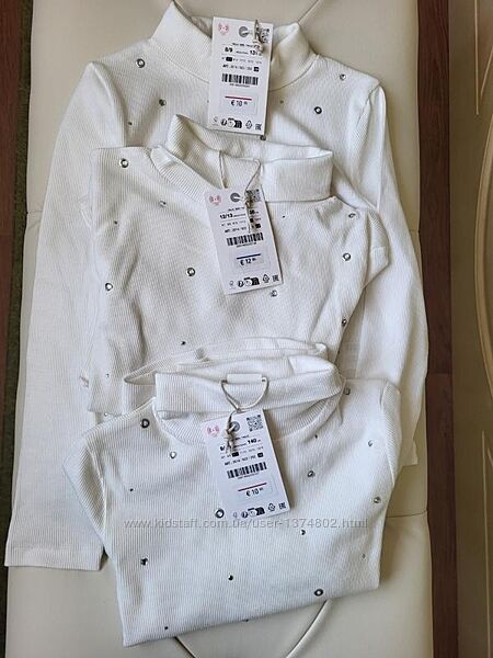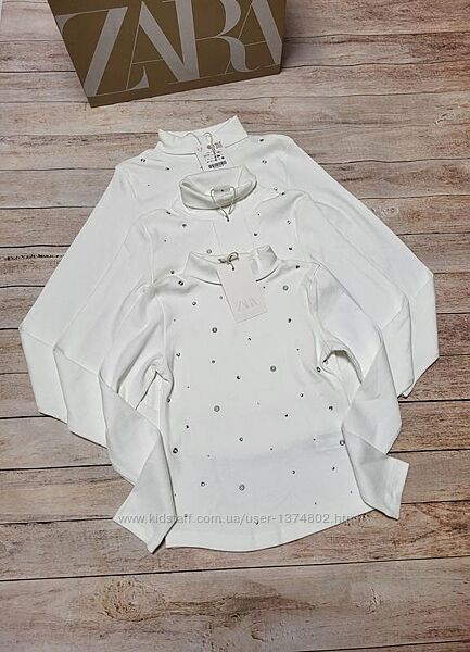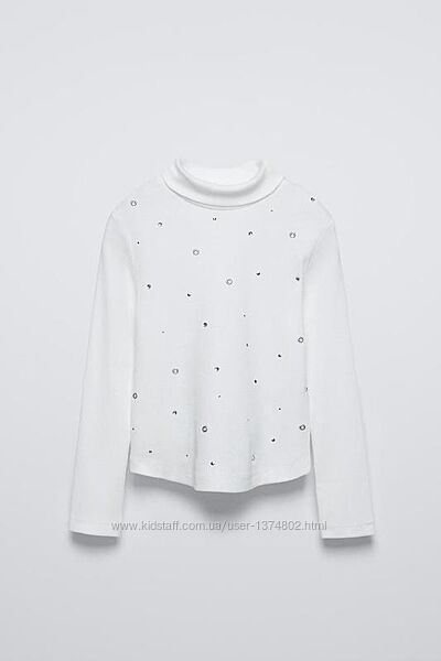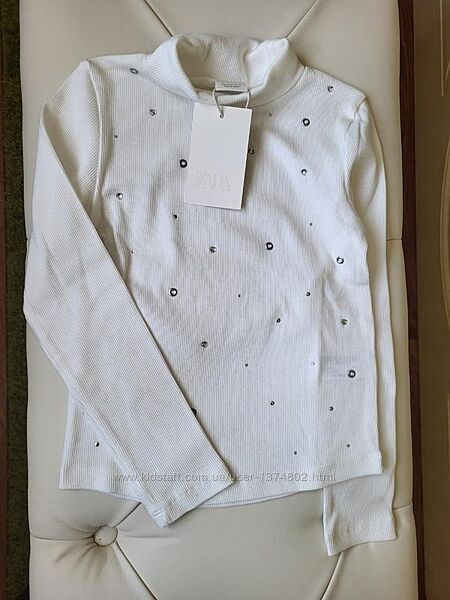 Новий дитячий білий гольф Zara в рубчик, кофта реглан під горло р. 130🌷Бавовняна водолазка прикрашена спереду стразами.