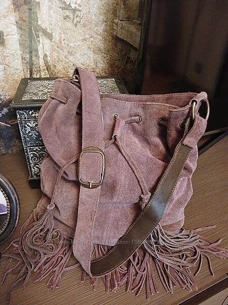 Подробное описание: Натуральная замшевая сумка хоббо с бахрамой