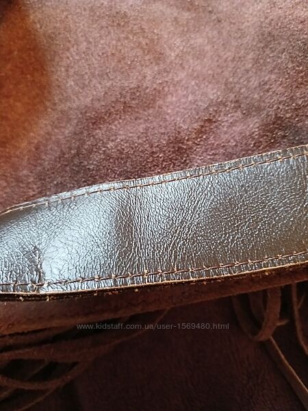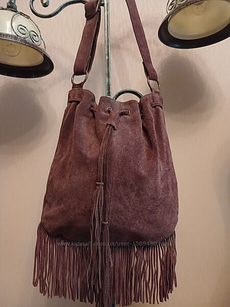 Сумка красивого шоколадного цвета с подтоном из натуральной плотной качественной замши. Длиный ремешок который регулируется, модная бахрома и хорошая вместительность. Состояние отличное внутри котоновая подкладка в идеальном состоянии! Цвет и форма идеальная. Размеры сумки: Высота 39смШирина 38см.