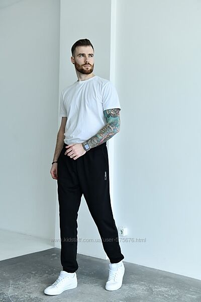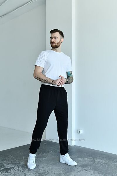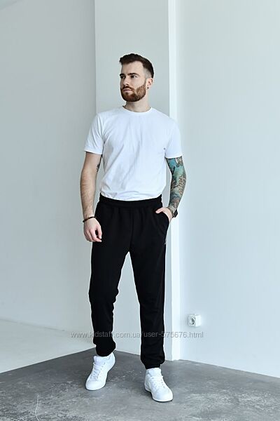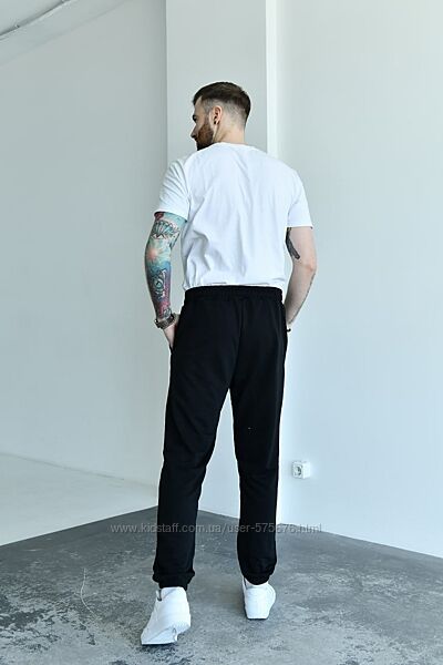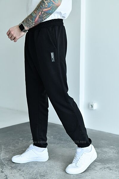 Чоловічі спортивні штани із трикотажу двонитки ( розтяжність середня). По талії забрані на резинку, в куліску протягнуто шнурок, посадка середня. В бічних швах оброблені кишені. Низ штанів на резинці. Декоровані нашивкою.