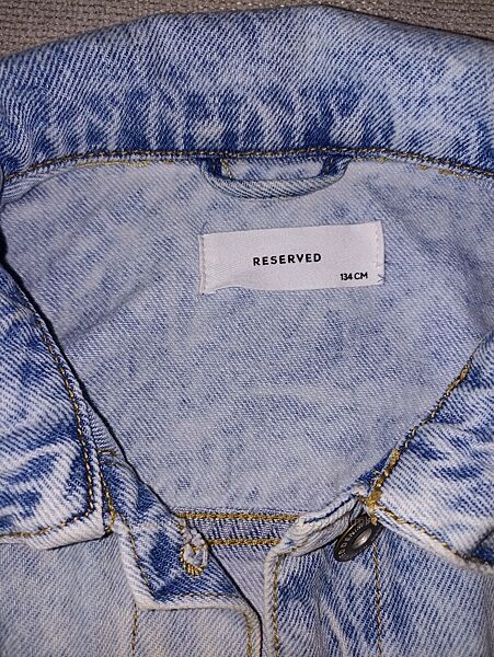 Джинсова котонова куртка піджак Reserved в хорошому стані. Колір блакитний. Розмір вказаний 134, але ми вдягали на 140.Довжина від плеча 48 см, плечі 34 см, рукав 47 см, ПОГ 40 см.