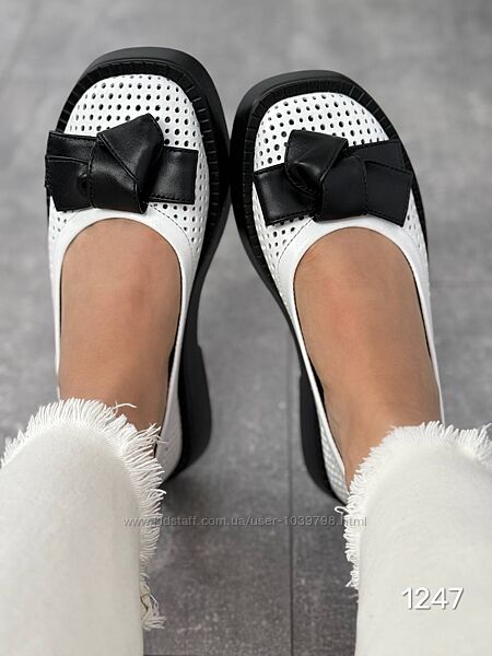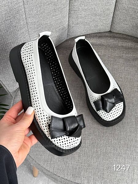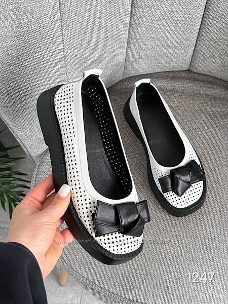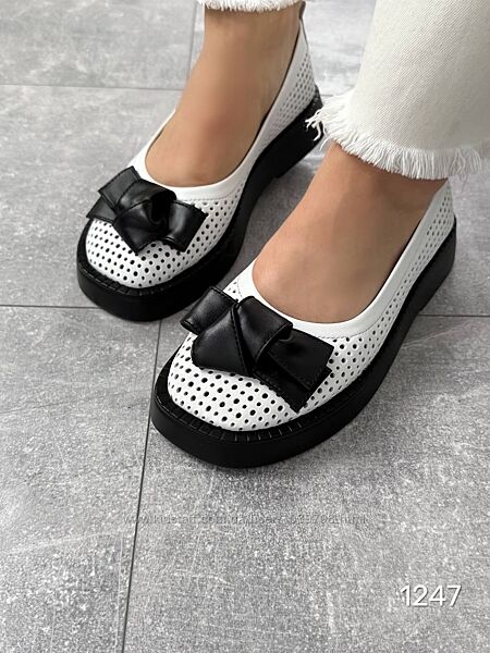 Туфлі Roses Колір : білий+ чорний Матеріал : Натуральна шкіра , перфорація Розміри : 36-41 (в розмір) Висота підошви : 3,5 см 36 - 23,5 см 37 - 24,0 см 38 - 24.5 см 39 - 25,5 см 40 - 26 см 41 - 26,5 см