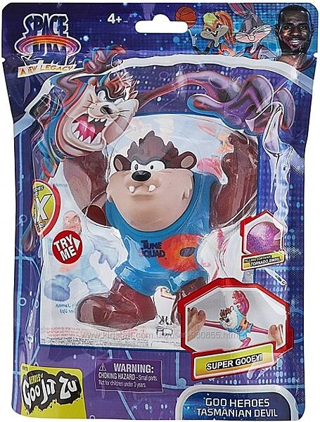 Тасманійський диявол супер липкий! Він одягнений у свою майку Tune Squad і має особливий наповнювач «Tornado Swirl»! Витягніть його тіло і спостерігайте, як воно повертається до початкових розмірів і форми! Є 4 Space Jam: A New Legacy Goo Hero Action Heroes, кожен з яких має різну начинку Goo, включаючи Жуків, Леброна Джеймса (Power Up) і Леброна Джеймса з начинкою «Power Basketball». Збери їх усіх!