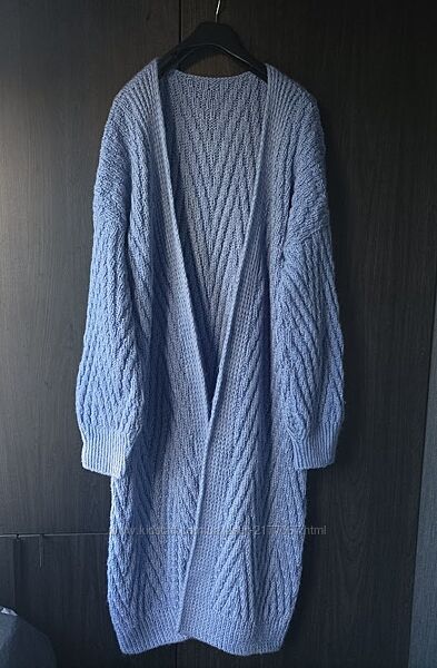В´язаний теплий кардиган зі спущеними плечима із напіввовняної пряжі.Колір блакитний.
