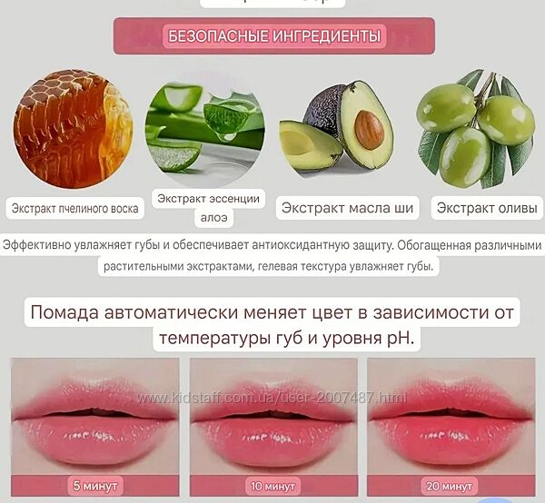 При нанесенні фарбує губи в рожевий стійкий колір від натурального до насиченого.