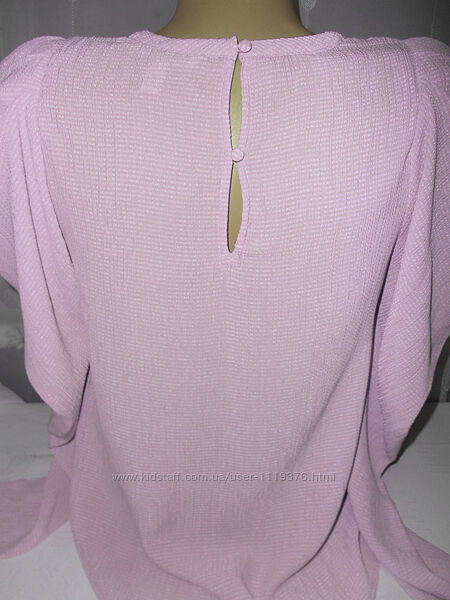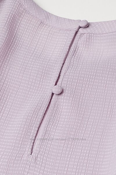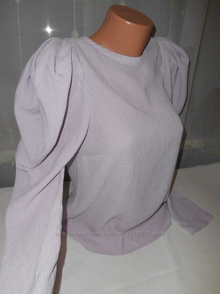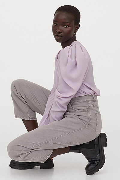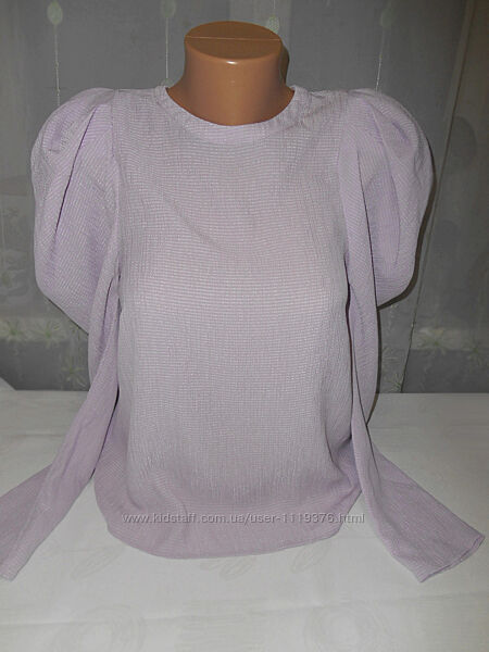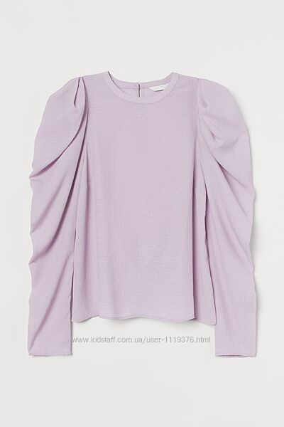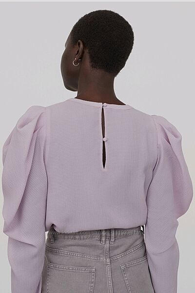 Блузка из структурной ткани с обшитыми тканью пуговицами и длинными, пышными, присборенными сверху рукавами, сужающимися к манжетам.