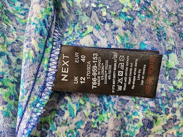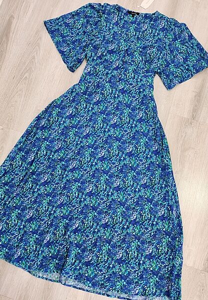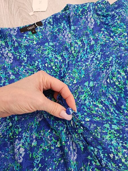 Очень женственная,модель платья миди ярко синего цвета с принтом от Next Англия.Выскоза 12-14,L-XL На обработанных пуговках до талии,в талии со спины широкая резинка