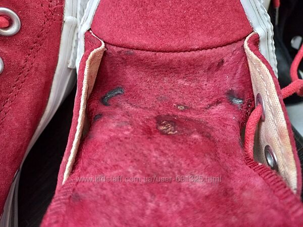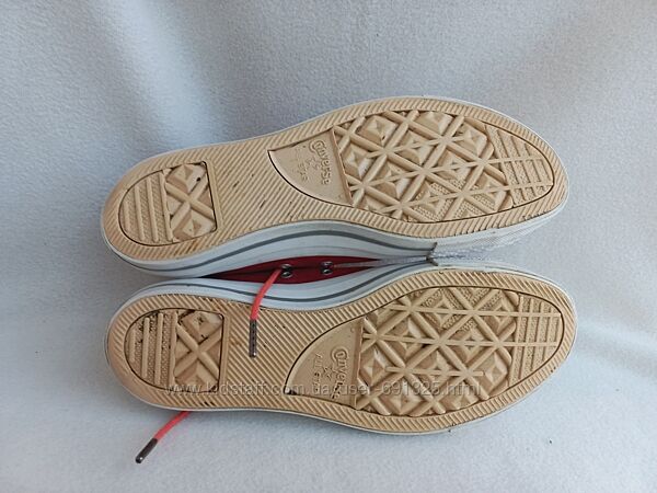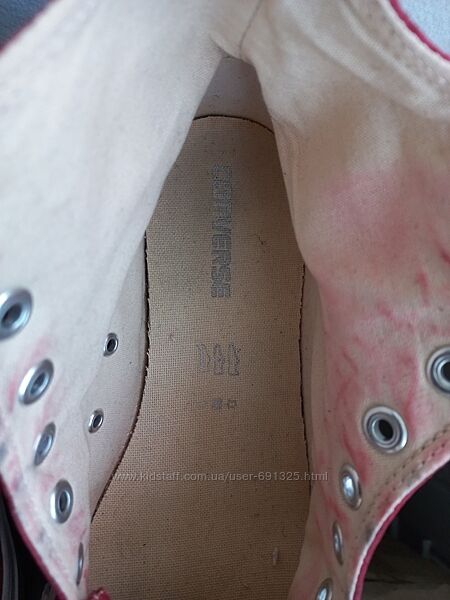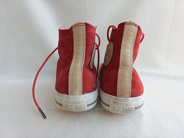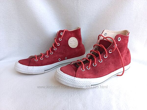 Пропоную червоні високі кеди з натуральної замшевої шкіри, від Converse. Вживані пару разів, трохи не підійшов розмір. Стан дуже добрий, але є якісь плями, но під шнурками не видно, дивіться фото.Розмір вказано 9/11/42,5. Довжина устілки всередині 28,3 см.