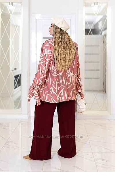 Брюки-труби, вільні, тканина тягнеться, висока посадка, в поясі гумка та шльовки для ременя, є кишені.