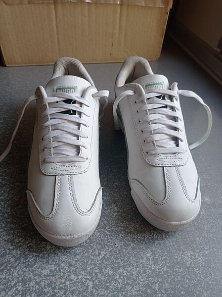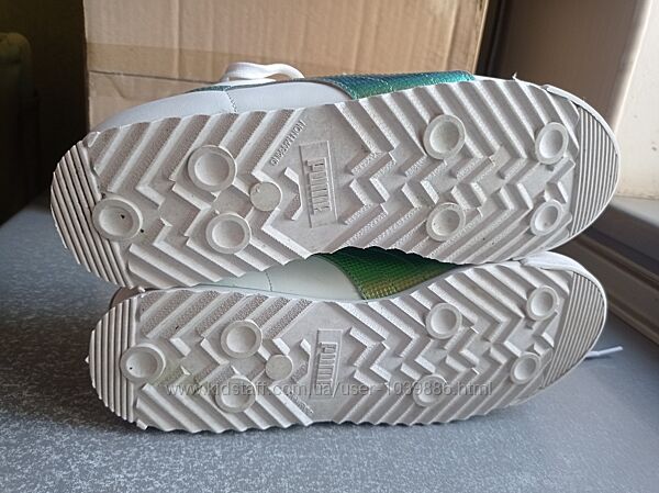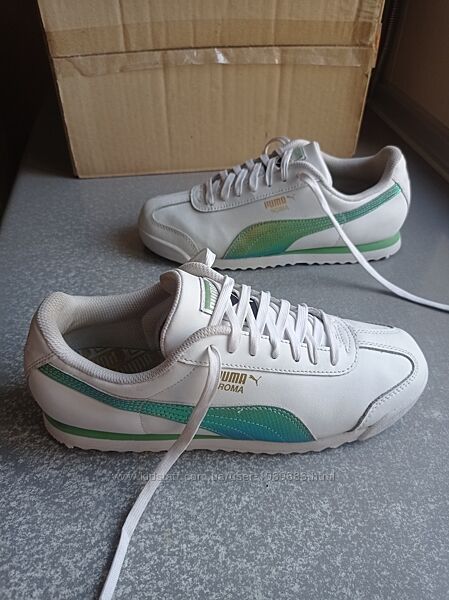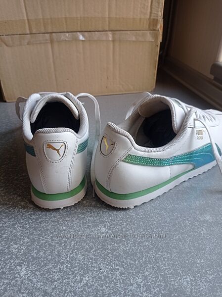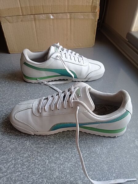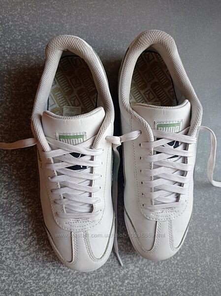Кросівки Puma Roma Basic, оригінал, відмінний стан, білі з зеленим перламутром, натуральна та еко шкіра, класична широка шнурівка, оригінальні вологопоглигаючі ортопедичні устілки, дуже красиво виглядають на нозі, дуже легкі м´які та зручні, прекрасно підійдуть для занять спортом та повсякденної носки, унісекс, розмір EU 41 -41.5, US 8.5, UK 7.5, повна довжина устілки 26.5 см.Другие объявления продавца