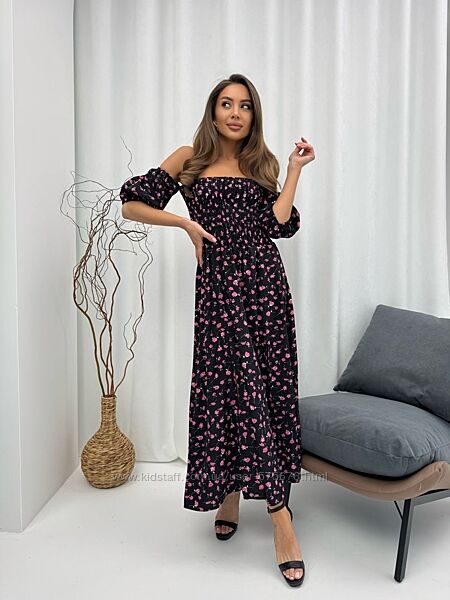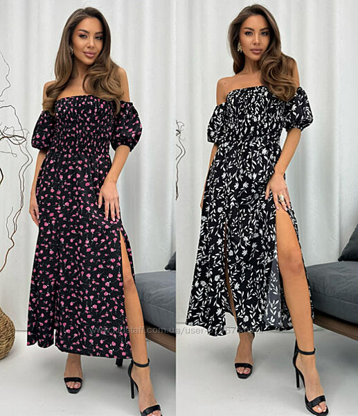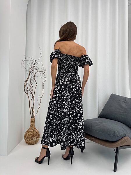 Сукня-максі з жаткою на грудях, відкритими плечима та рукавами-ліхтариками. Виріб приталеного крою з розкльошеною довгою спідницею, декорованою двома розрізами.