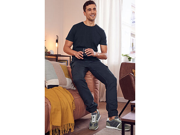 Чоловічі штани-карго від бренду LIVERGY®. Зручно носити завдяки високому вмісту бавовни. З бічними та задніми кишенями. Модний, зручний фасон із гумками знизу на штанинах та накладними кишенями із клапаном на кнопці. З гумкою та шнурком на талії для зав´язування. Нормальна висота талії. Оптимальна посадка завдяки еластану LYCRA®.Заміри: довжина 107, ширина по поясу 40.5 (регулюється), ширина по бедрам 50 (півобхвати), кроковий шов 79.5