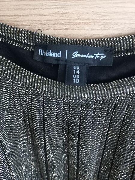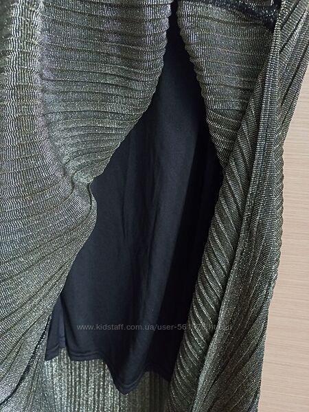 Тканина поліестер плісе з золотистою люрексовою ниткою. Повністю на підкладці. Збоку розріз. Є пояс. Тканина не мнучка.НОГ 50 см, в талії і бедрах вільне, довжина від середини плеча 135 см.