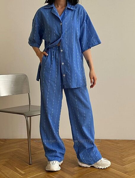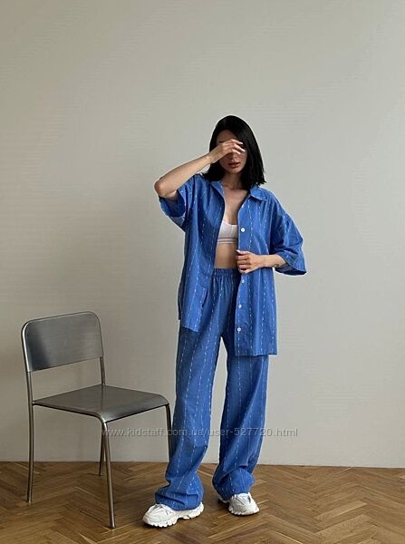 наличие уточняйте пожалуйстаЖенский летний легкий брючный костюм: рубашка+брюки. Рубашка прямого кроя, рубашечный воротник, плечевой шов приспущенный, свободный рукав длиною до локтя; брюки прямого кроя, пояс на резинке, комфортная посадка, имеются боковые карманы.