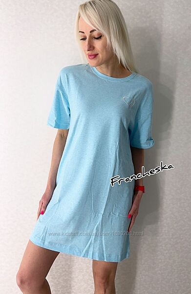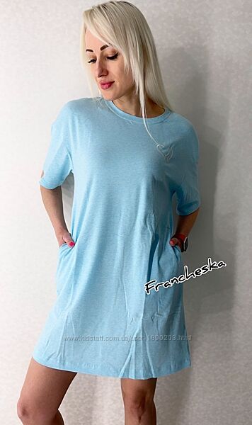 Однотонна блакитна жіноча домашня сукня з колекції "KATE" (LDK 121/41/01) від українського виробника ELLEN.Жіноча нічна сорочка (домашня сукня) виготовлена з м´якої якісної бавовняної тканини однотонного блакитного кольору, довжиною вище колін. Домашня туніка має вільний покрій оверсайз, з короткими рукавами, заниженим плечовим швом, і круглим вирізом горловини, зручними бічними кишенями, на грудях зліва прикрашена ніжним принтом. Нічна сорочка дуже зручна та комфортна, відмінний варіант одягу для дому та подарунка коханій та близькій людині.