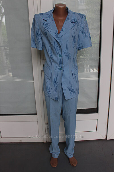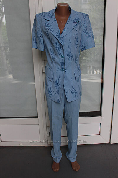Стильный женский брючный костюм голубого цвета — отличный выбор для повседневного или офисного образа. Модель состоит из пиджака с коротким рукавом и классических прямых брюк. Ткань приятная к телу, с легким рисунком, хорошо держит форму и не сковывает движения. Производство — Украина. Идеально подходит как для работы, так и для прогулок и мероприятий.