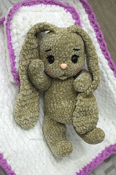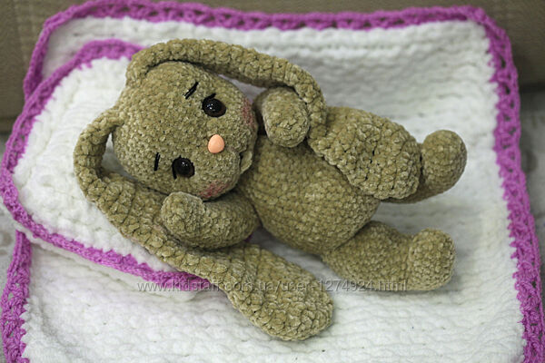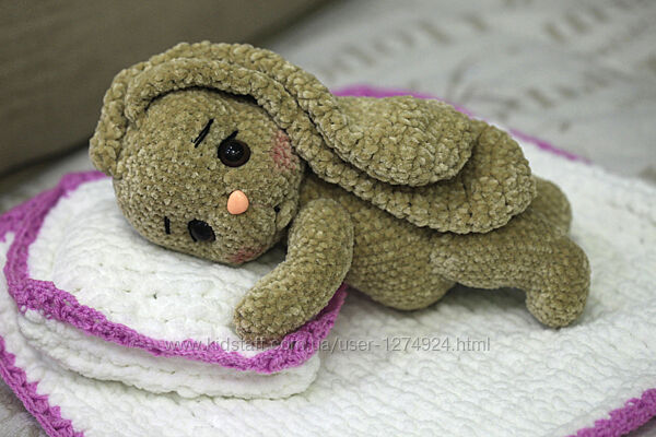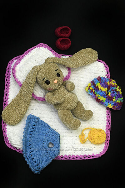 Зайка с одежками, одеялом и подушкой связана крючком из плюшевой пряжи. Размер 24 см. Голова поворачивается, лапки сгибаются, внутри медная проволока. Наполнитель холлофайбер. Одежда снимается. Подарочная упаковка, ручная работДругие объявления продавца