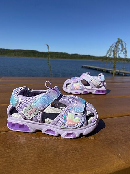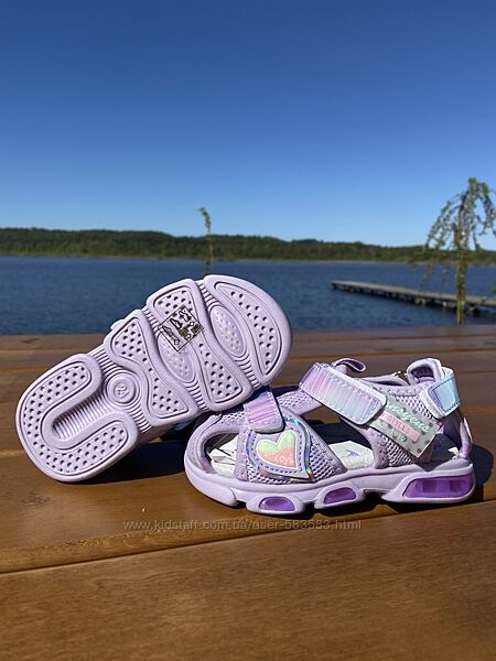 У підошві вбудовані світлодіоди, які вмикаються при натисканні на устілку. Вони слугують лише додатковим декоративним елементом без гарантії та можуть працювати кілька днів. Головна особливість цієї моделі – стильна напіввідкрита модель босоніжок.