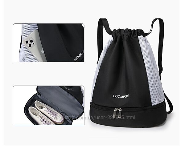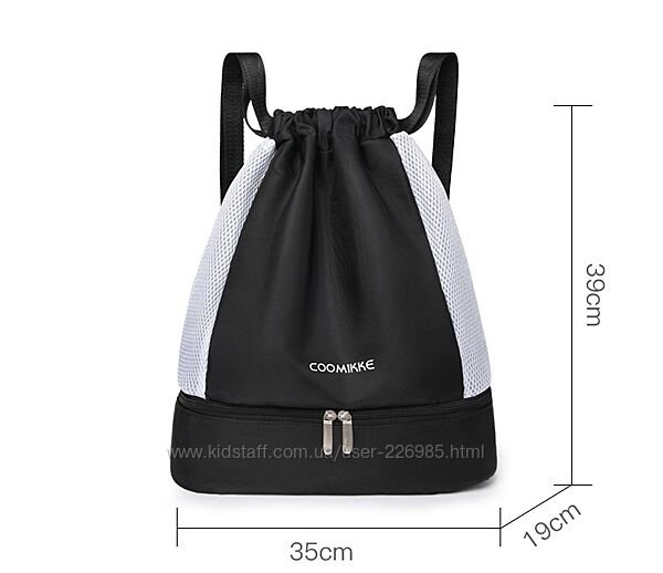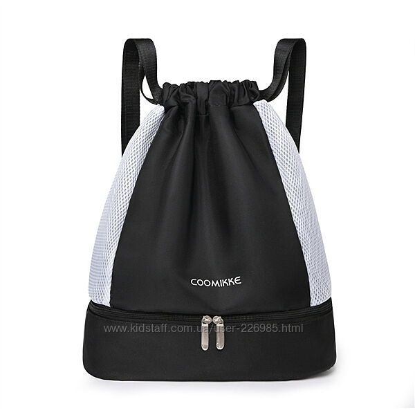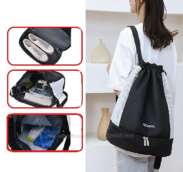 Ця універсальна сумка-рюкзак для спорту з безліччю відділень — ідеальний помічник для школи, басейну, фітнесу.· Зручний дизайн на шнурку, мотузки також можна використовувати як ремені для плечей· Внизу є окреме відділення для взуття · З внутрішньою великою вологонепроникною кишенею для зберігання вологих речей