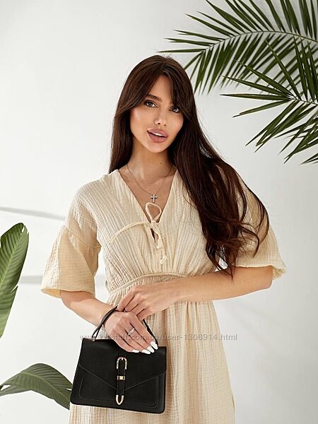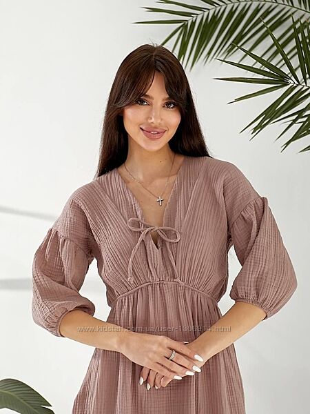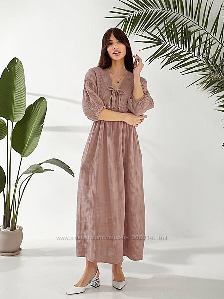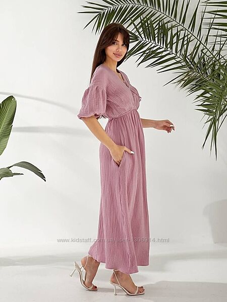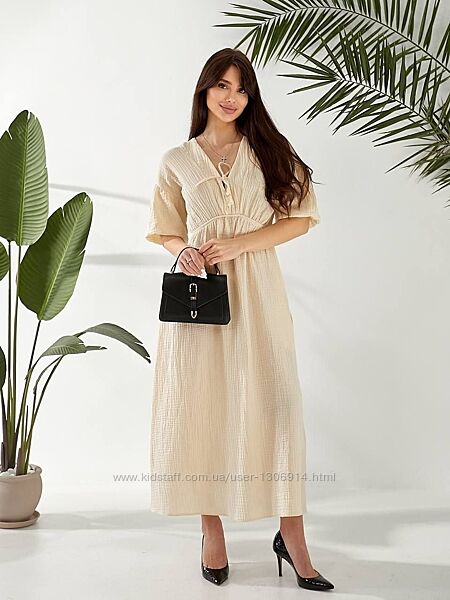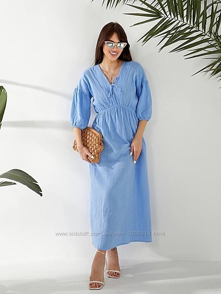 Літня сукня міді довжини, рукав 2/3 довжини, талія залишена, з кишенями по бокам. Манжети рукава на резинці