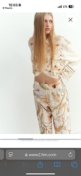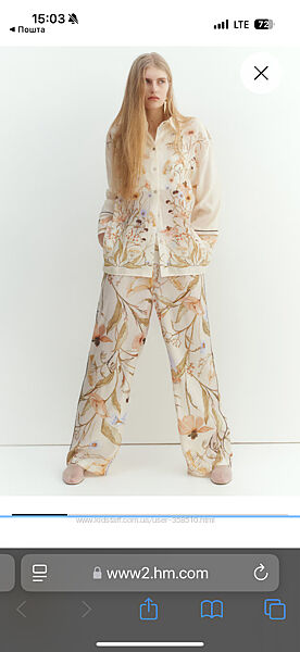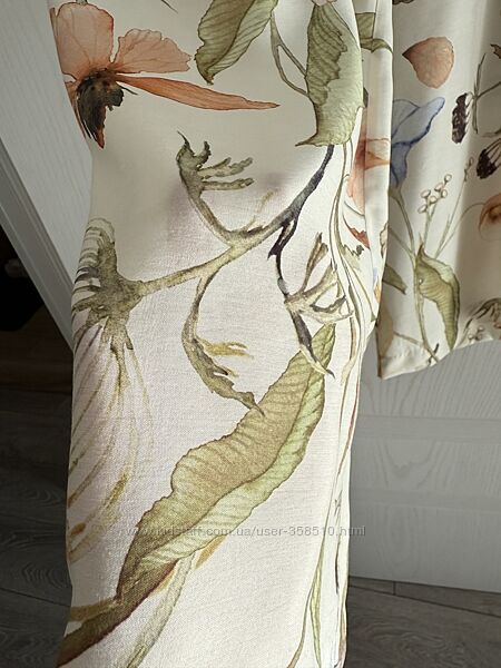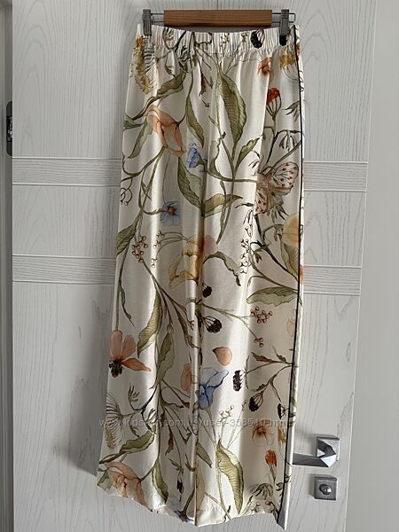 Дуже легка дихаюча тканина. 100% віскоза, ідеально на літо. Гарний квітковий принт у натуральних відтінках. Дуже гарні, продаю, бо не вгадала з розміром. В талії резинка, посадка висока. Повна довжина 105 см і є трохи запасу, можна відпустити. Ширина штанини по низу 28 см. По стегнах 54 см.