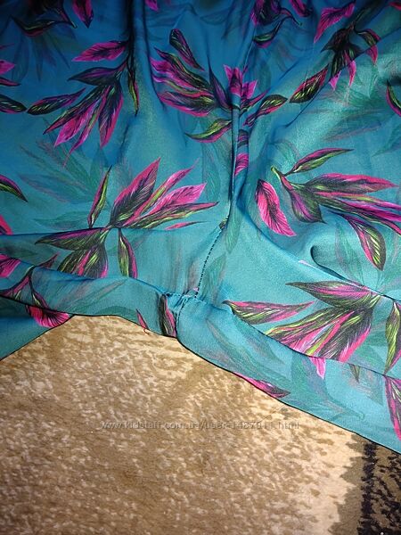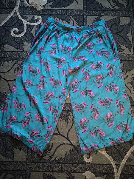 Штаны брюки женские летние. Размер 62, цвет синий с зелёным оттенком, с цветочным принтом. Силуэт прямой, свободный, пояс - на резинке. Материал: плотная, мягкая, лёгкая шёлковая ткань - очень приятная на ощупь. Не мнётся - после стирки не требует утюжки.Длина 92см, окружность пояса 110см, окружность бёдер 145см, ширина штанины ( на уровне бедра) 40см, в самом низу 42см. Глубина посадки: спереди 34см, сзади 45см.