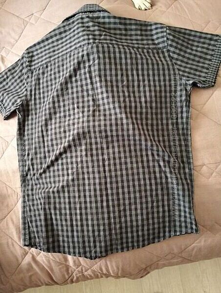 Сорочка на хлопця з коротким рукавом, чорна з сірою клітинкою на гудзиках, зріст 140-146, вік 10-11років, склад тканини- бавовна. Заміри 53см довжина, ширина 40см.
