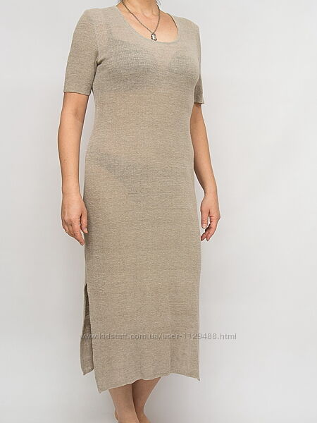 Изделие ручной работы, выполнено из текстурного натурального льняного трикотажа, в природном цвете. Длинное, по бокам разрезы. Очень приятное к телу, дышащее, не жаркое. Конечно просвечивает, на фото специально показала с черным бельем. Отлично подойдет как нижний слой для создания современных стильных динамичных многослойных образов.