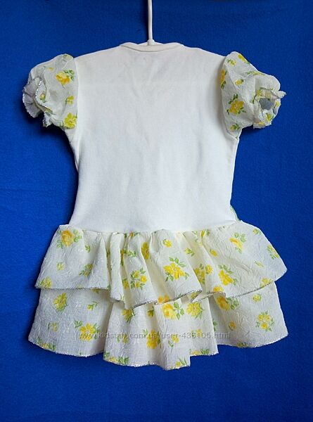 --Плаття літнє святкове у відмінному стані. Без дефектів, тільки ззаду під горловиною зашита крихітна дірочка.--Склад ліфа-100% бавовна, рукавчики і волани спідниці-100% поліестр.