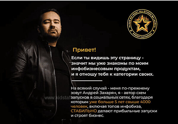 На всякий случай - меня по-прежнему зовут Андрей Захарян, я - автор схем запусков в социальных сетях, благодаря которым уже больше 5 лет свыше 4000 человек, включая топов инфобиза, СТАБИЛЬНО делают прибыльные запуски и строят бизнес.
