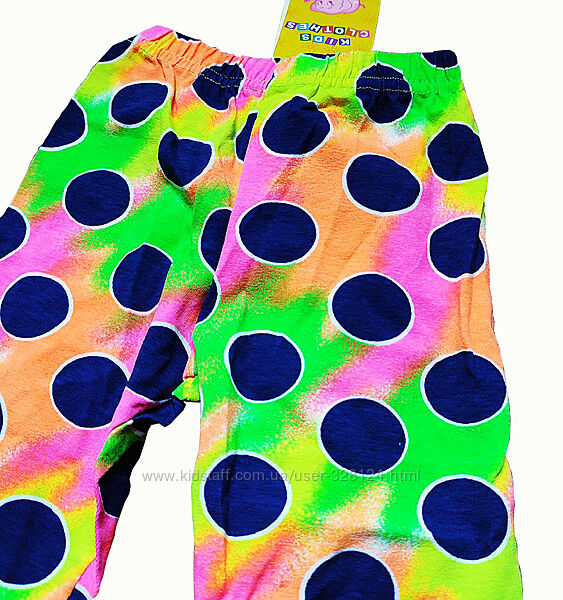 Лосины для тех, кто не боится выделяться: фон из неоновых оттенков словно ускользает из-под крупного темно-синего гороха. Смелый выбор для самых дерзких модниц!)95% хлопок, 5% эластан.