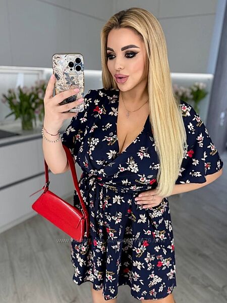 Комбінезон з імітацією спідниці-шортиків , які не будуть натирати , талія на резинці + фіксується поясом, з боків кишені, на грудях запах, рукав-волан, на спинці виріз, який фіксується канатиками.