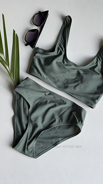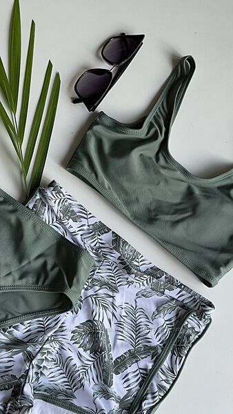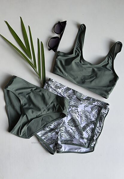 Роздільні купальники зеленого кольору з принтом білих візерунківВерх топ - з підкладкою попереду і чашечками , на широких бретельках, низ - плавки бікіні , в комплекті спортивні шорти