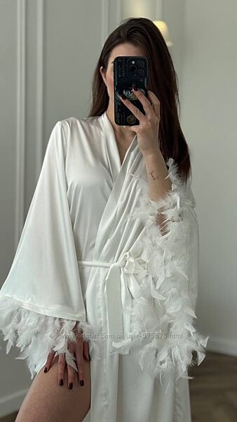 Елегантний довгий шовковий халат з пірʼям.Халат має довжину максі, тим самим створює вишуканий образ. Має вільні широкі рукави та фіксується поясом на талії.