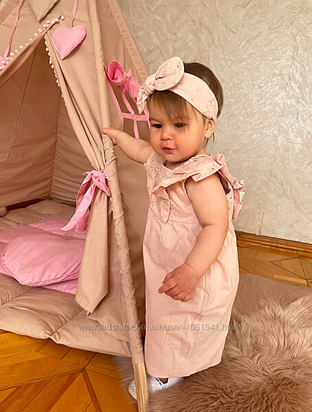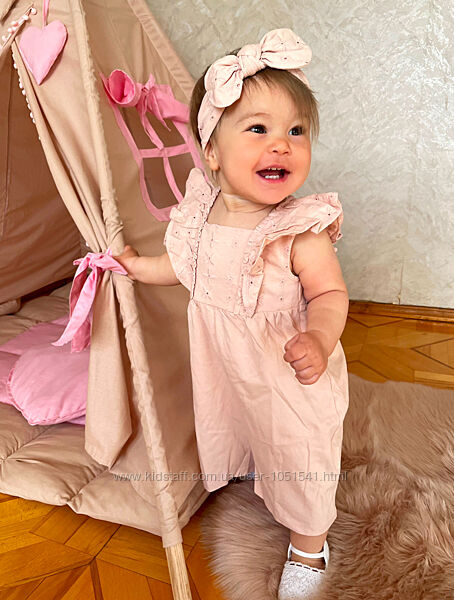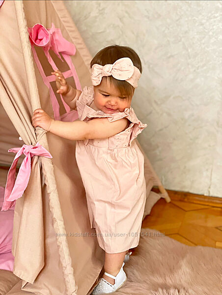 Комбез- пісочник від H&M з рюшами на короткий рукав , на спині кнопки , низ-шорти , в комплекті - пов"язкаКолір -рожевий з вишивкою