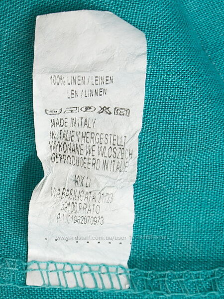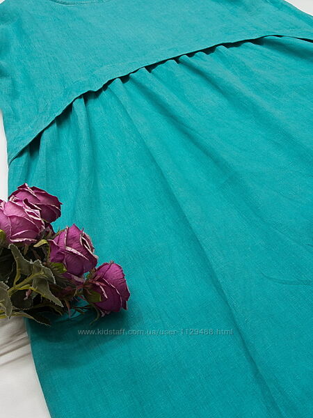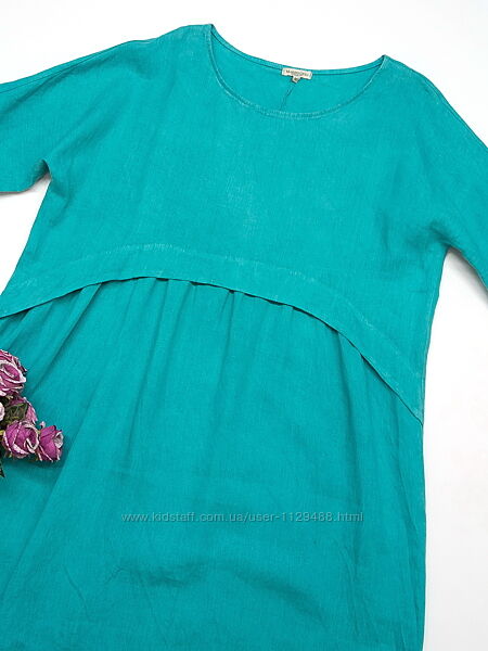 Легкое, просторное, длинное, рукав цельнокройный, спинка немного длиннее переда. Выполнено из мягкого натурального льна в бирюзовом цвете с легким эффектом варки, дышащее, не жаркое, очень приятное к телу.
