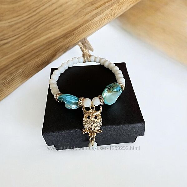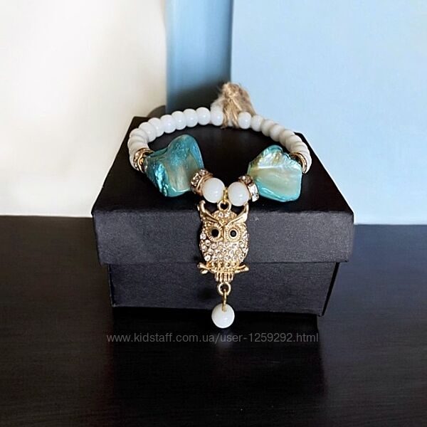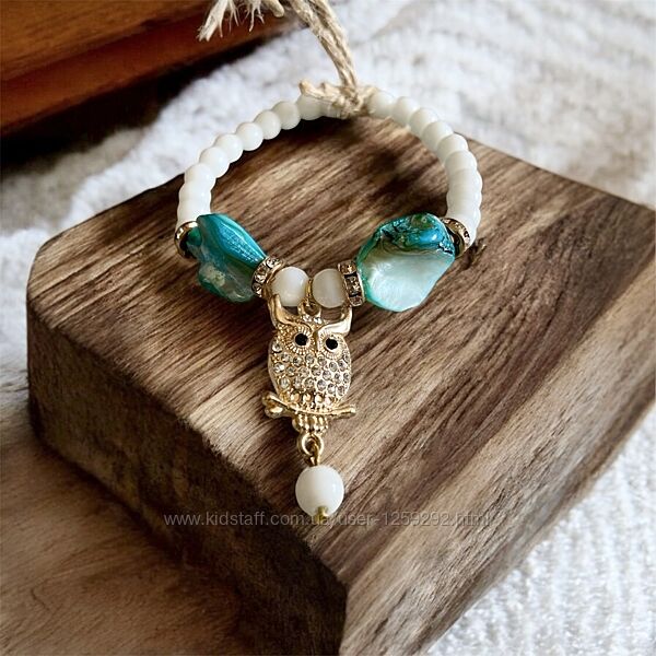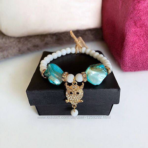 Авторский Браслет ручной работы из белого агата и натурального перламутра с подвеской совой🦉