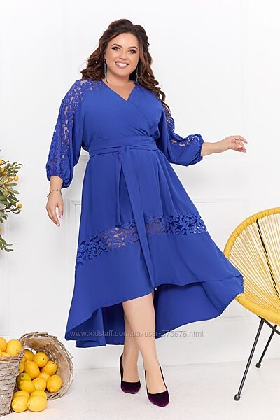 Неймовірно жіночна сукня в вечірньому стилі із софта зі вставками гіпюру (розтяжності тканини немає). Ліф сукні з ефектом запАха, по талії зібрана на резинку. Низ асиметричний - попереду коротший, позаду довший. Рукав довжиною 3/4, цільнокроєний, зібраний на резинку. Пояс із основної тканини в комплекті. Застібок, кишень немає.