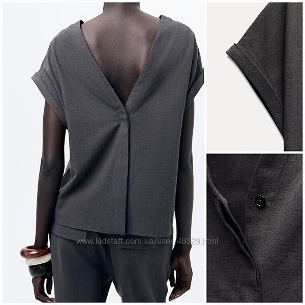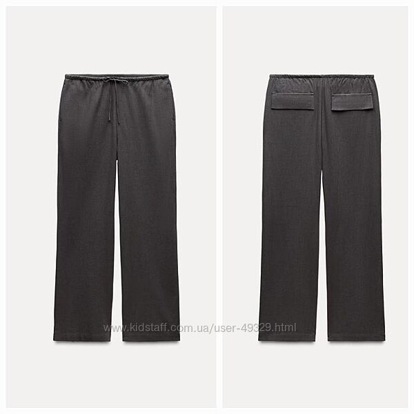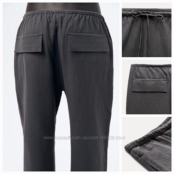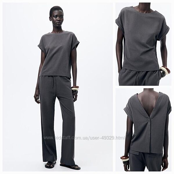 Літній трендовий костюм Zara zw collection з сумішевого льону. Оригінальна модель з сорочкою з V-подібним вирізом ззаду. Короткі рукави з відворотами. Застібається на потайні гудзики ззаду. Штани в піжамному стилі з високою талією. Еластичний пояс із регульованою зав’язкою, бічні кишені та кишені з клапанами ззаду.Повністю натуральный склад з бавовни і льону. Красивий сірий колір. Розмір М.