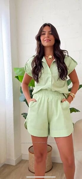Сорочка застібається на ґудзики, кишені робочі. Шорти - в талії на резинці, є кишені.