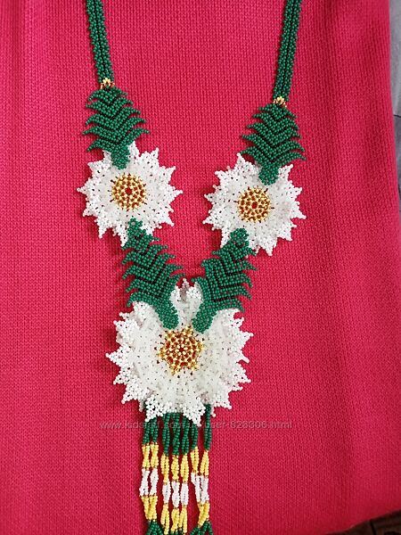 Гердан з бісеру ручної роботи (використаний для виробу бісер Preciosa (Чехия) та бісерна нитка). Кольори: зелений, білий, жовтий, золотистий. Загальна довжина 43 см, ширина великої квітки 9 см, вага близько 90 гр. Євнаявності. Можлива оплата накладним платежем,але за умови передплати вартості доставки.