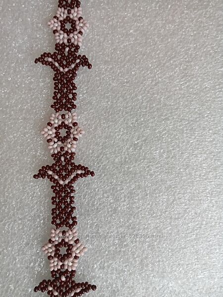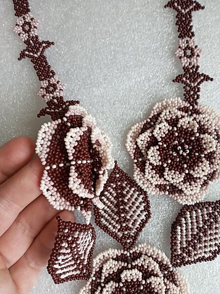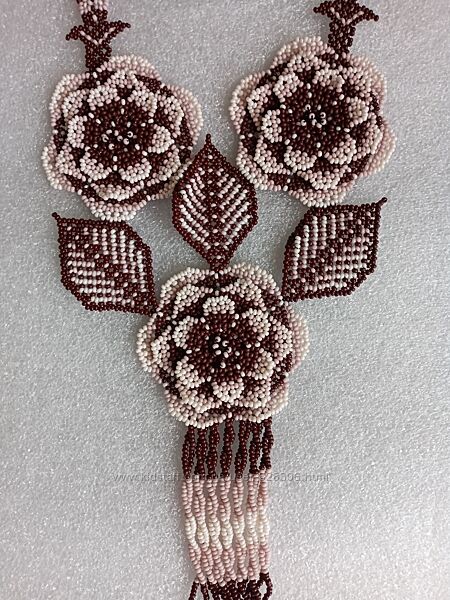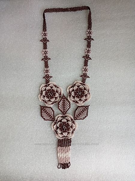 Гердан, уічольські квіти ручної роботи з чешського бісеру (шоколадий, какао та молочний колір). Для плетіння використовувалась бісерна нитка (титан). Загальна довжина 56 см, загальна ширина (де квіти) 14 см. Є внаявності.Самовивіз з м.Ірпінь або перешлю за домовленістю.