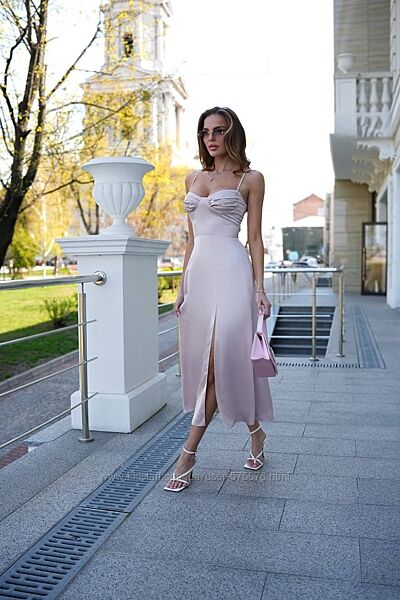Сукня з ніжного даблшовку з акцентом на декольте - збірка на чашках візуально додає об´єм і підкреслює форму. Ефектний розріз на нозі додає витонченості та легкості. На спині - прихована блискавка та регульована шнурівка з корсетною імітацією для ідеальної посадки по фігурі.size: 42, 44, 46