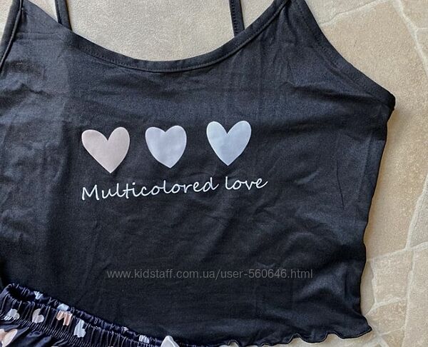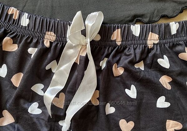 Відмінна якість! Комфортний, стильний, складається з шортиків та короткої майки- топа. Трикотаж м´який, приємний до тіла, не просвічується. Склад: 95 % поліестер, 5 % еластан. Вказано розмір М, ОБОВ´ЯЗКО дивіться виміри в спокійному стані в описі. Майка: на тонких бретелях. НапівОГ 40, напівобхват внизу 38, довжина близько 42, довжина бокового шва 23, довжина по спинці 23 см. Шорти: пояс – гумка. Декоративний бантик. НапівОТ 34, напівОБ 47,посадка 29/39, довжина 31 см. Колір чорний, принт-сердечки. Дефектів нема. Увага! Усі речі Shein приходять без паперової бирки. Є лише пакувальні пакети із логотипом. Це абсолютно нові речі.