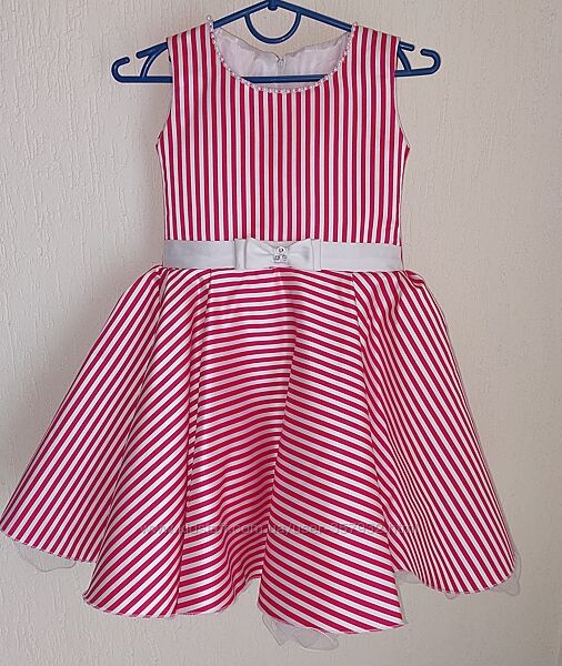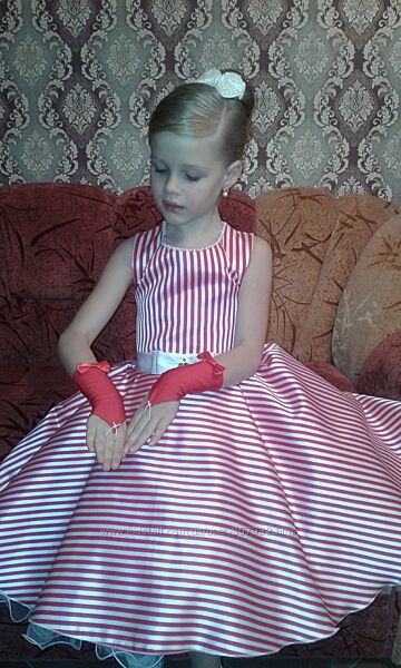 Сукня на випускний або святкова сукня для дівчинки. Застібається на блискавку, об´єм можна регулювати шнурком на корсет. Тканина плотна, добре тримає форму. Має декілька нижніх спідниць з фатіну та білої плотної тканини. Червоні перчатки в подарунок.Довжина сукні 73 см.
