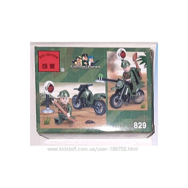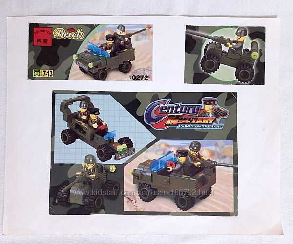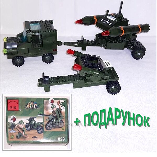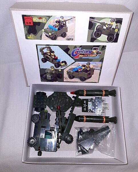 Б/у конструктор фірми BRICK з деталями кольору хакі для будівництва військової техніки, військових машин + у подарунок набір Сапер з мотоциклом, Мінер 829 в рідній коробці з інструкцією (мініфігурка, аксесуари та мотоцикл). У наборі більше 150 деталей, з яких зібрано машину типу джипа з набору Jeep 0272 та причіп ракетна установка, схожа як у наборі Rocket Truck – 0277. Продаються у зібраному вигляді. У позашляховика відкривається капот, дах кабіни, двері. До джипа на фаркоп чіпляється ракетна установка з платформою, що обертається, яка також може змінювати кут нахилу. І цю ракетну установку можна міняти на зенітку – другий причіп до позашляховика. Ця машина зібрана дитиною частково на основі фото з інтернету, інструкції джипа та частково на основі творчого підходу та бажання використовувати якомога більше деталей. А ви зможете придумати та зібрати свої варіанти військової техніки.Для старту як зразок можете використати інструкцію джипа за посиланням
