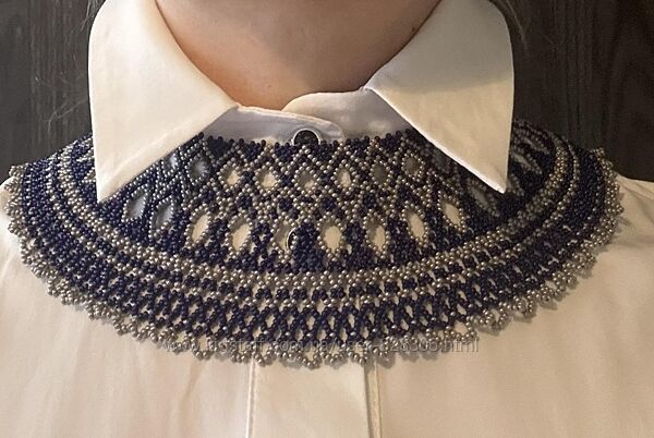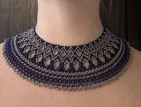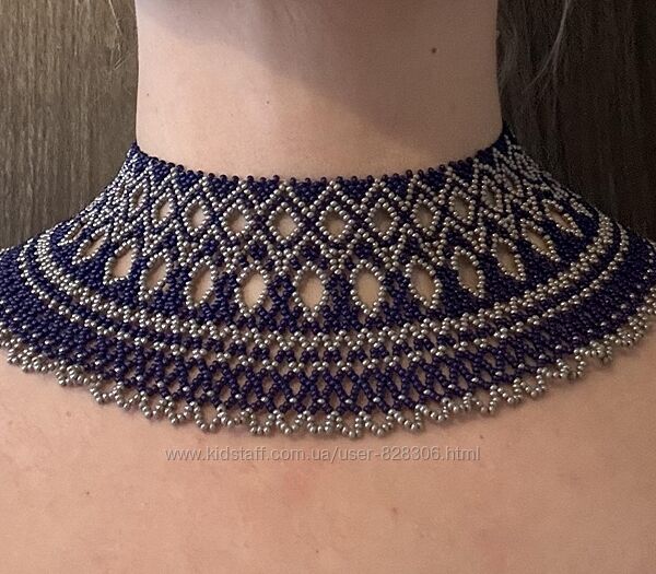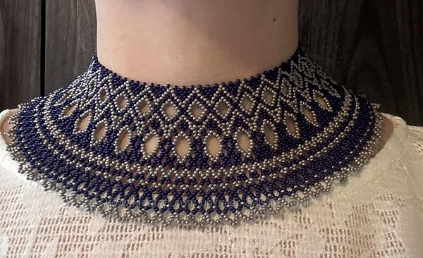 Силянка, чокер ручної роботи з бісеру. Можна носити і як чокер, і як силянку. Кольори : темно синій та сріблястий. Для плетіння використаний чешский бісер та бісерна нитка. Мінімальна довжина 36 см, максимальна 43 см (з подовживачем), вага 72 гр, ширина 7 см. ЄвнаявностіСамовивіз з м.Ірпінь або перешлю за домовленістю.