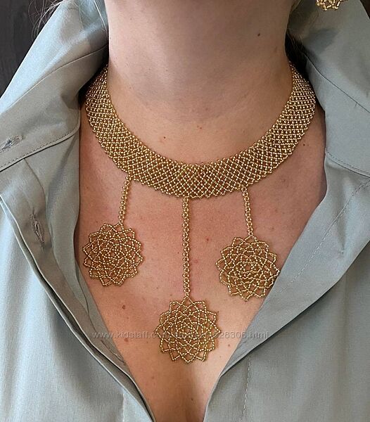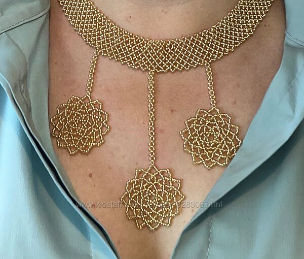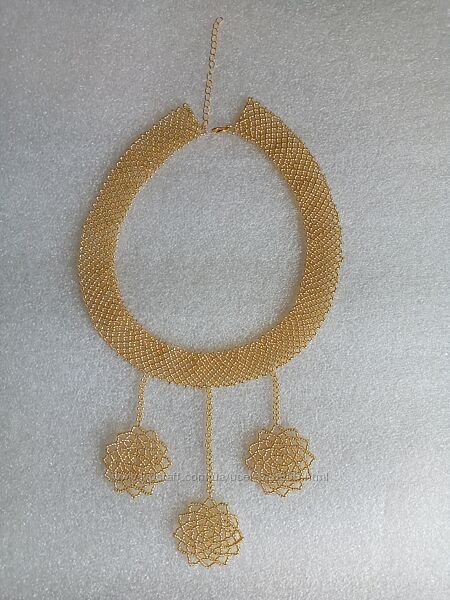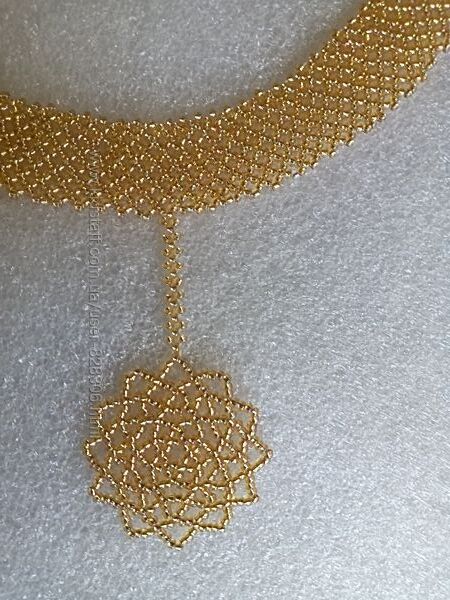Комплект з бісеру ручної роботи золотого кольру (чокер і сережки). Для плетіння використовувалась бісерна нитка (титан) Чокер довжина 40 см по внутрішньому краю, 7 см ланцюжок-подовжувач і 1 см застібка карабін (загальна довжина 40-48 см).Ширина чореку 2 см і з підвісками 12 см. Сережки діамерт (плетіння з бісеру) 3 см і загальна висота з застібкою 5 см. Є внаявностіСамовивіз з м.Ірпінь або перещлюза домовленістю