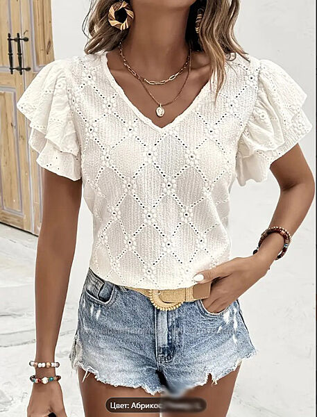 0455Блузка легкая для лета, из тонкого нарядного, гипюрового трикотажа с крылышками, V-образный вырез впереди, ткань тянется.